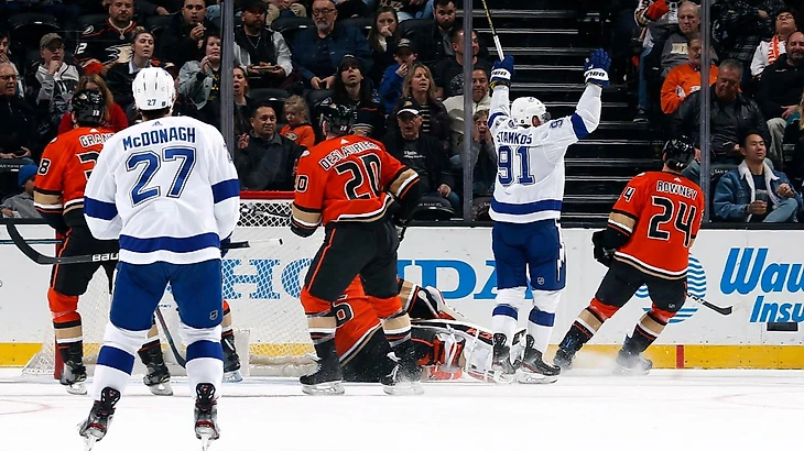 "Анахайм Дакс"-"Тампа-Бэй Лайтнинг" 3:4.Энтони Чирелли и Никита Кучеров набрали по 2 очка (1+1),Андрей Василевский отразил 23 броска.У хозяев Рикард Ракелл и Майкл Дель Зотто набрали по 2 очка (1+1),Райан Гецлаф отдал 2 результативные передачи.