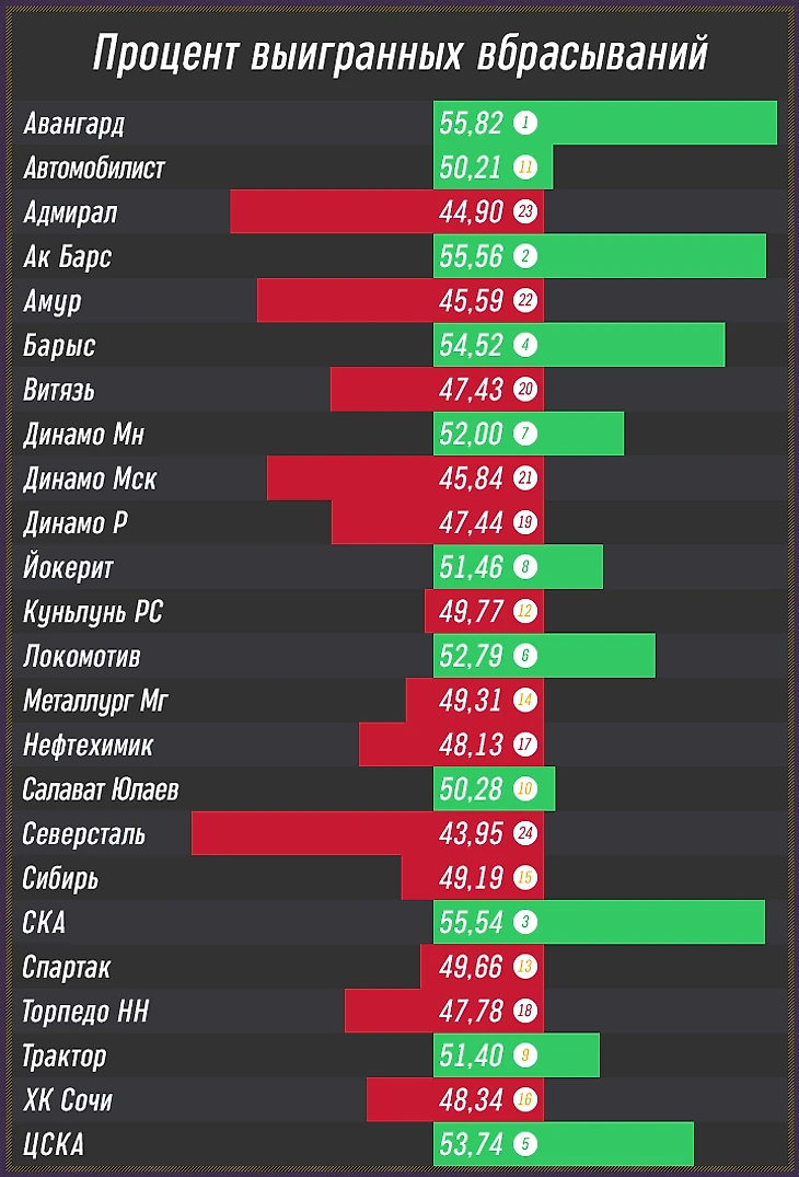 По игре на точке три явных лидера, по пятьдесят пять с половиной процентов выигрывают Авангард, Ак Барс и СКА. На один процент меньше у Барыса, на два – у ЦСКА. Меньше сорока пяти процентов у Северстали и Адмирала, стабильные проблемы со вбрасываниями у Шипачёва московского Динамо.