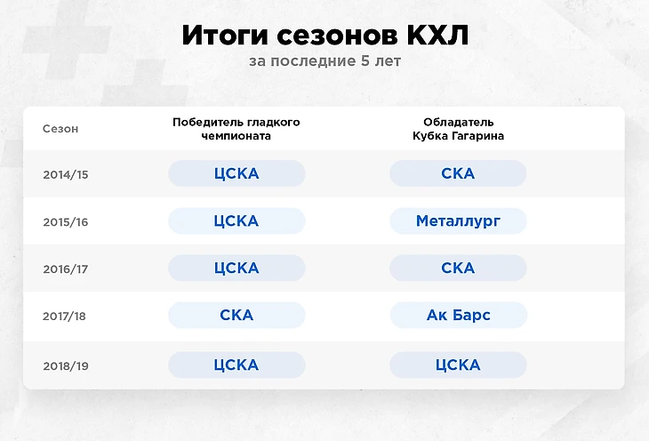 В последние годы КХЛ стала сильнее, разнообразнее, хотя и предсказуемее. Здесь больше нет сенсационных финалистов типа “Льва”, ХК МВД и отчасти "Трактора", зато каждый год Кубок Гагарина берут разные команды. Сначала эстетский СКА Быкова, затем “команда одного звена” Воробьева (на самом деле нет), потом межгалактический состав Знарка в Питере, выдавший в регулярке рекордную серию из 20 побед подряд. Ну и системный “Ак Барс” Билялетдинова, разбивший мощный ЦСКА в финале 2017/18.