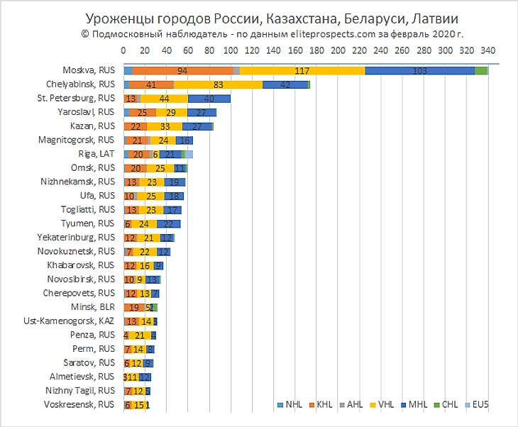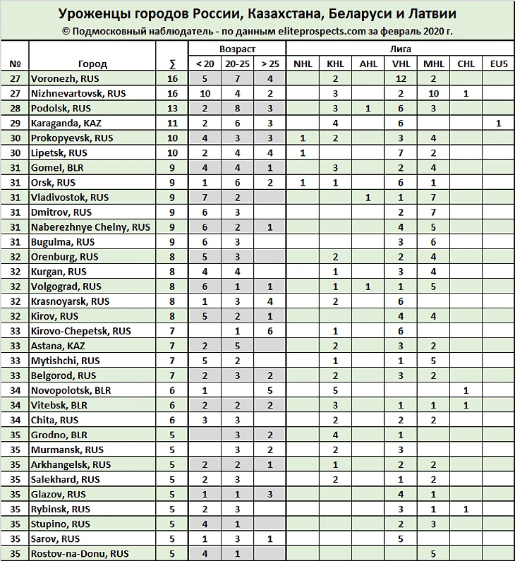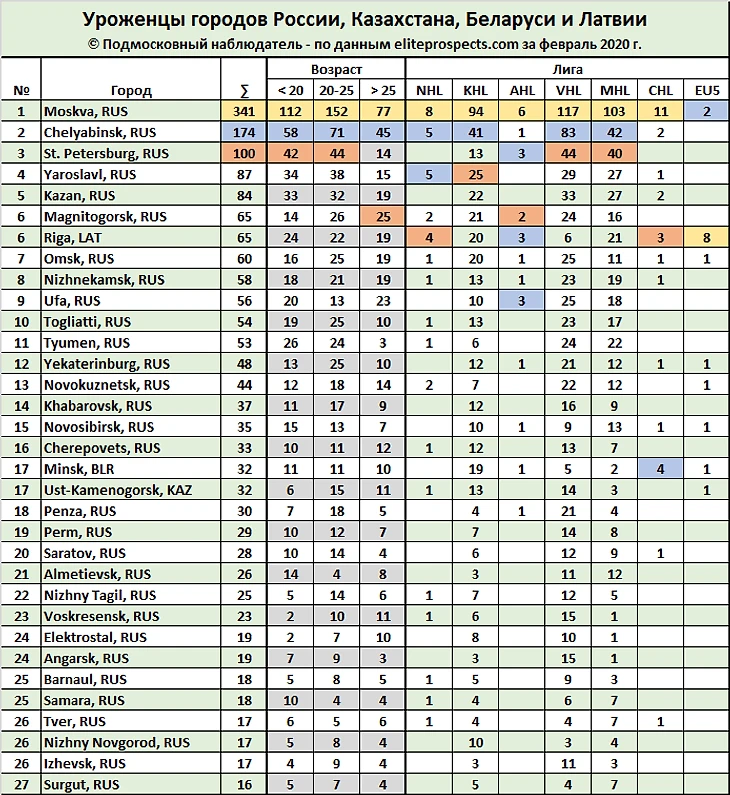 Портал www.eliteprospects.com предоставляет огромное количество хоккейной статистики. В этот раз попытаемся разобраться уроженцев каких городов России, Казахстана, Беларуси и Латвии больше всего в современном профессиональном хоккее. Рассмотрим сведения «Place of Birth» действующих игроков NHL, КХЛ, AHL, ВХЛ, SHL, Liiga, чешская Extraliga, NLA, DEL, а также молодежных лиг МХЛ, OHL, WHL и QMJHL.