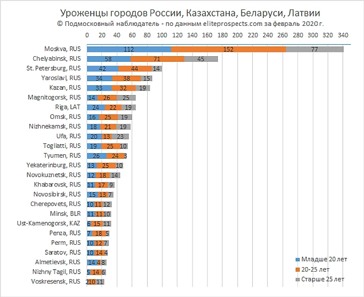 Тройка городов рождения игроков возраста от 20 до 25 лет снова повторилась, Москва – 152 хоккеиста, второе место Челябинск – 71 игрок, третья позиция Санкт-Петербург – 44 хоккеиста.