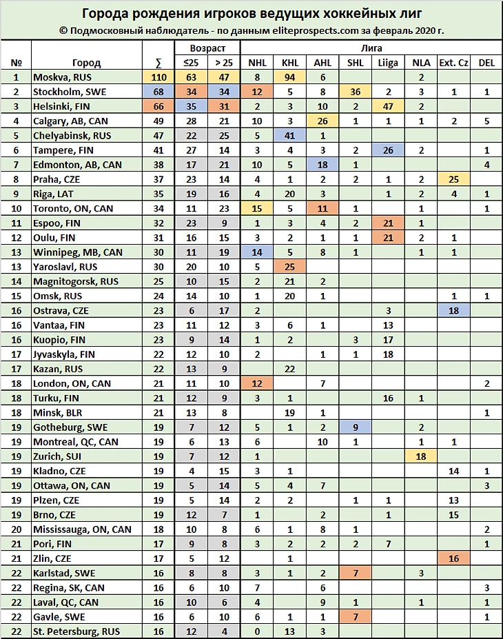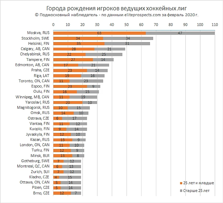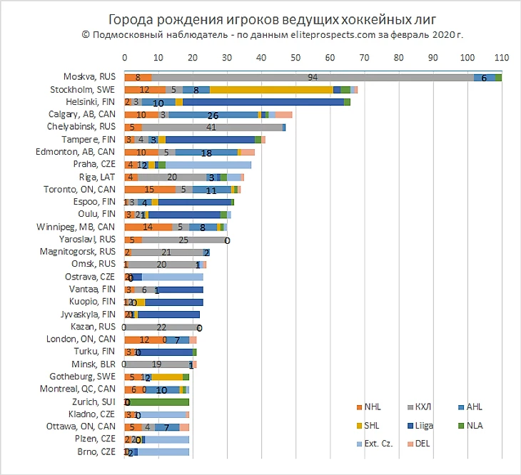 Уроженцев Москвы, Стокгольма и Хельсинки больше всего в мировом хоккее, для NHL это Торонто, Виннипег и Лондон