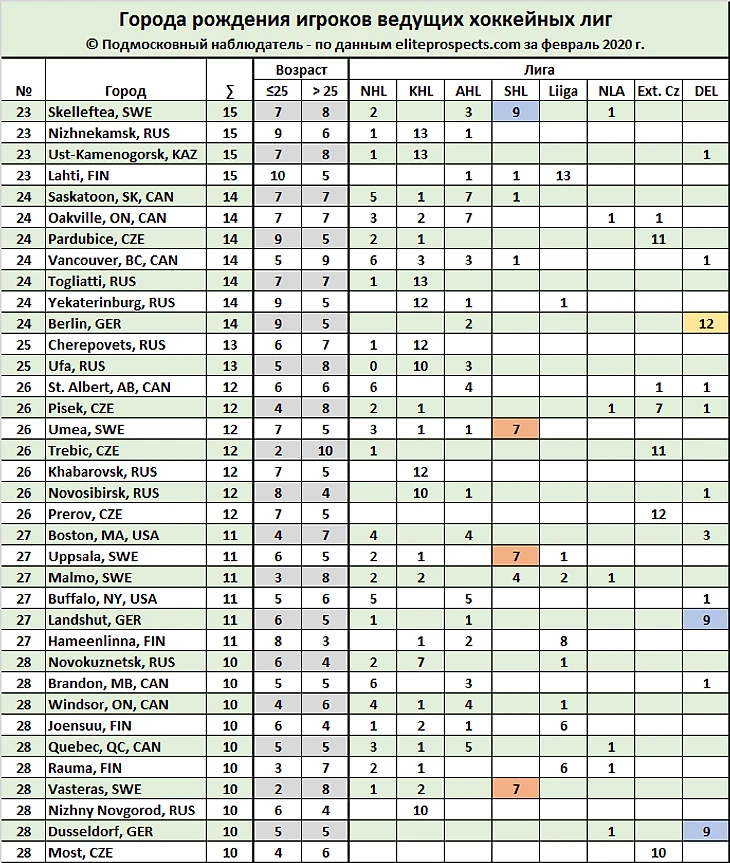 Разбираемся уроженцы каких мировых городов дали наибольшее число игроков для восьми ведущих хоккейных лиг NHL, КХЛ, AHL, SHL, Liiga, чешской Extraliga, NLA и DEL.
