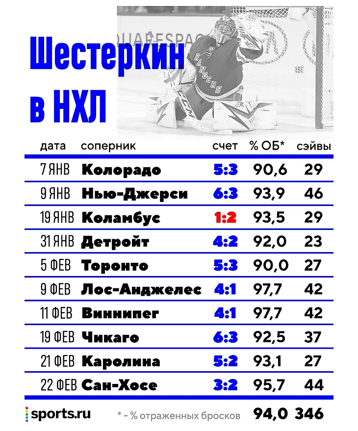 Игорь играет в НХЛ меньше двух месяцев, но его уже воспринимают как элитного вратаря. Даже главный тренер «Рейнджерс» Дэвид Куинн в начале февраля так описал новичка: «Чтобы стать великим, надо знать, что ты великий, и он это знает». При этом Куинн добавил, что играть в воротах будет лучший – и после этого основным на лед выходил чаще всего Шестеркин.