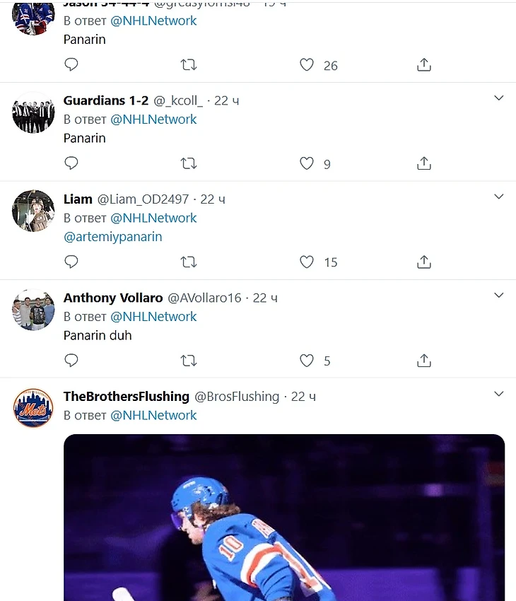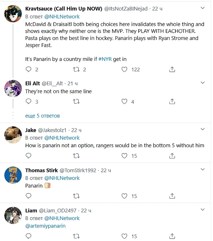 «Макдэвид и Драйзайтль обесценивают сам опрос, потому что они играют вместе. Паста играет в лучшей тройке лиги. Панарин играет с Райаном Строумом и Йеспером Фастом. Если «Рейнджерс» попадут в плей-офф, то у Панарина нет конкурентов».