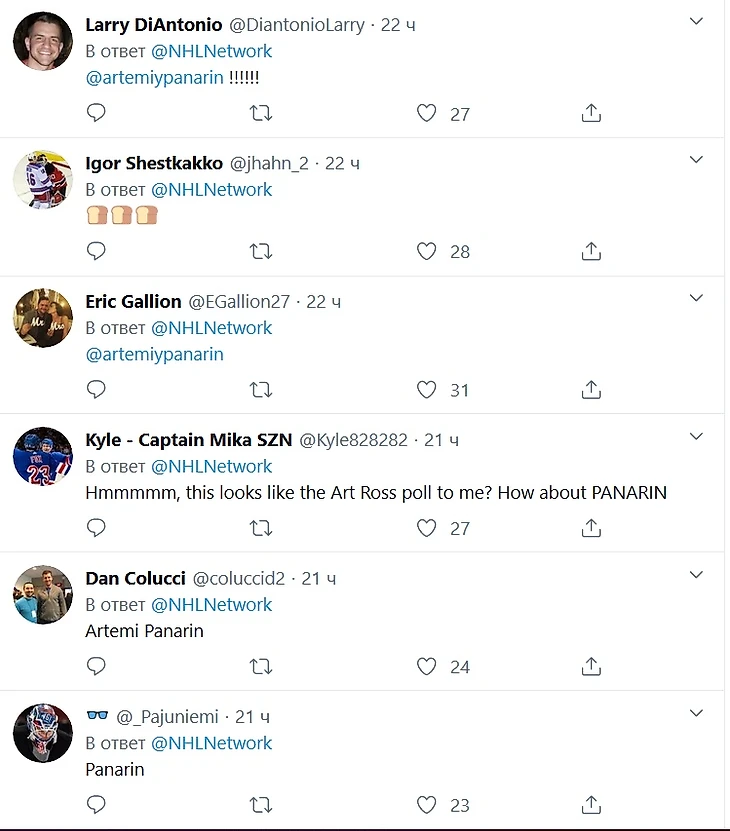 Другой юзер в ответ сделал свой опрос: там за MVP борются Панарин, Хлебушек, хозяин Рыжего и «хозяин «Айлендерс» (если вдруг у вас сегодня был плохой день, и вы не догадались – это один и тот же человек).