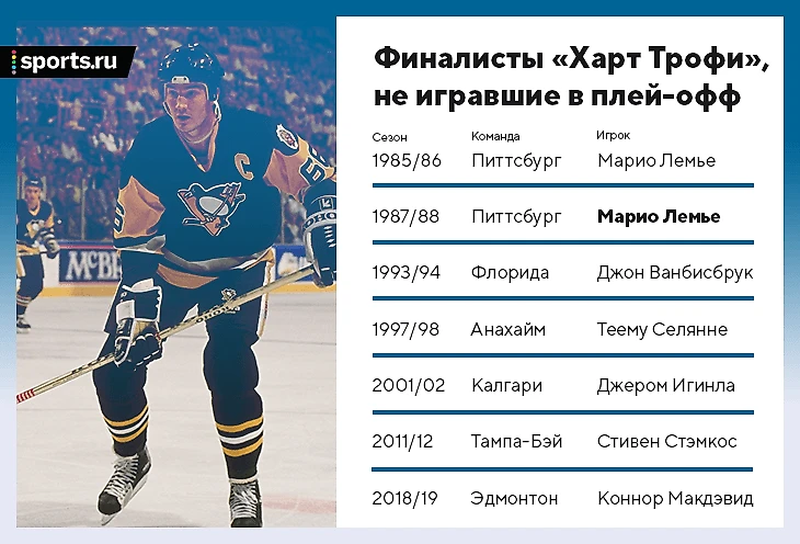 За последние 50 лет лишь семь игроков попадали в тройку финалистов «Харт Трофи», если их команда не вышла в плей-офф. Приз выиграл лишь один из них – Марио Лемье в 1988-м. Панарину будет ну очень сложно. Но то, что он в этом сезоне играет как MVP – факт.