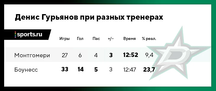 В отличие от ситуации Насреддин/Гусев в «Нью-Джерси», сначала Денис не получил никакой пользы от смены тренера – олдскульный Боунесс урезал время Гурьянову и Хинтцу, при этом увеличив игровое время чекеров типа Дикинсона или просто надежных парней типа Комо. При этом «Даллас» в целом остался таким же – плохо атакующим и отлично обороняющимся, при этом не особо смотрибельным.
