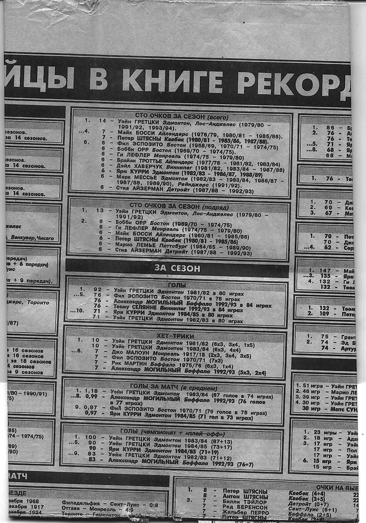 В шестом номере приложения «Хоккей от «СЭ» (июль 1995) последняя страница полностью посвящена теме «Европейцы в книге рекордов НХЛ». Упомянуто 11 карьерных собственно рекордов. Первые три рекорда это Голы/Передачи/Очки правого крайнего.