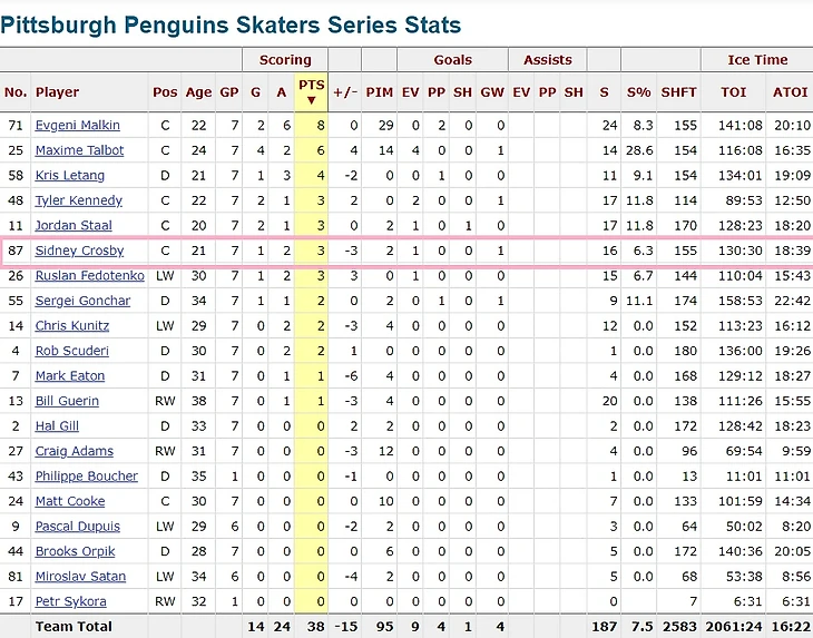Суммарный % на точке в плей-офф 2009 Кросби имел выше чем у Стаала 53 против 46,1, равно как и итоговое число попыток 530 против 362, но Байлсма тем не менее в домашних матчах упорно на стартовое вбрасывание бросал именно Стаала.