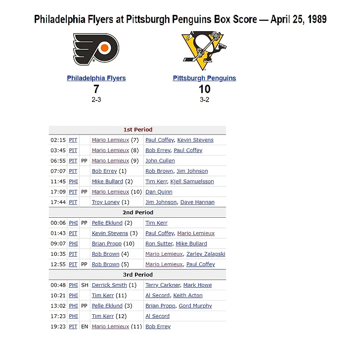 Большинство рекордов Лемье относятся к игре с Филадельфией в 2-м раунде плей-офф 1989.