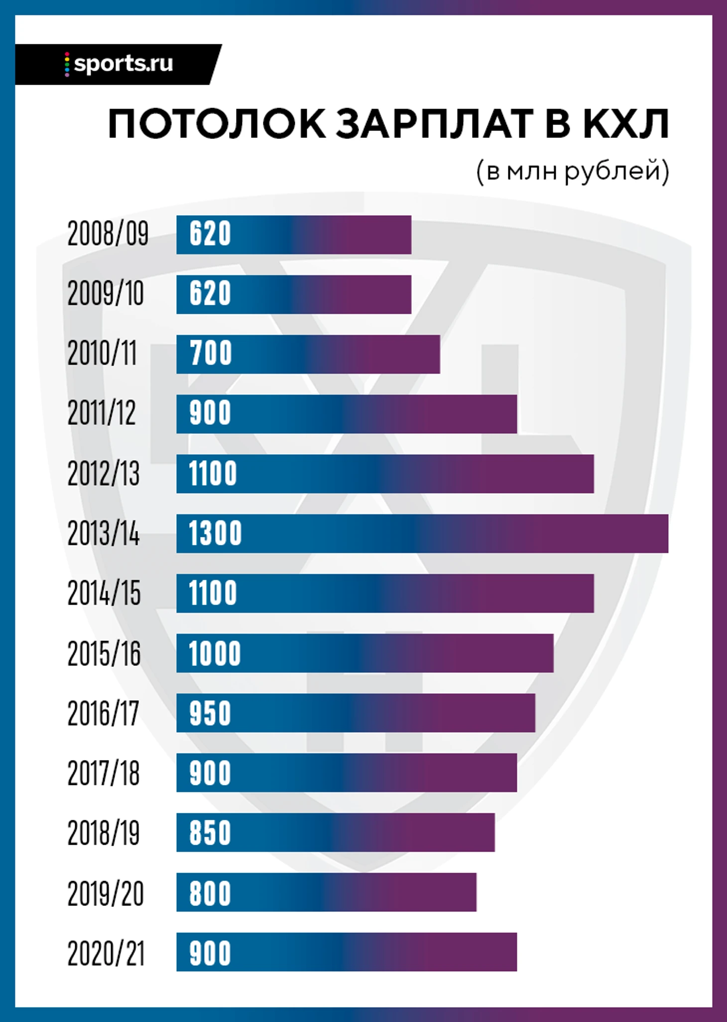 Весь год Дмитрий Чернышенко говорил о грядущем потолке в 600 млн с двумя послаблениями, что все-таки выглядело маниловщиной: лига, которая за 10 лет до этого собиралась бороться с НХЛ, решила сократить зарплатные бюджеты топов до зарплаты одного-единственного Ковальчука в сезоне-2013/14 (если считать в долларах по курсу). Поэтому через год, весной 2018-го, решение переиграли: потолок в 900 млн, но без вывода звезд за потолок. Так как параллельно из лиги выставили еще и «Ладу» с «Югрой», этого никто особо не заметил.