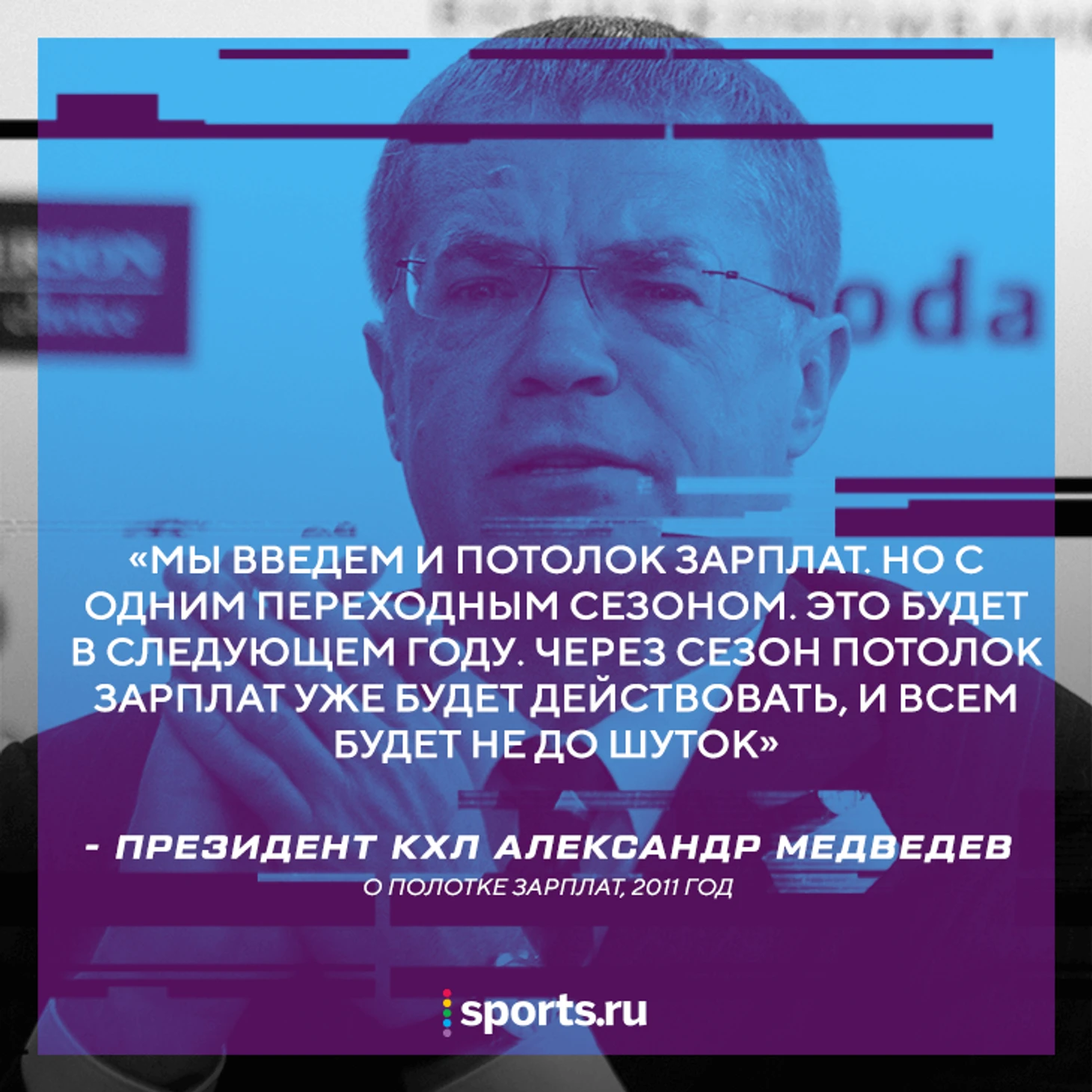 В феврале 2011-го Александр Медведев был уже серьезен: «Мы введем и потолок зарплат. Но с одним переходным сезоном. Это будет в следующем году. Через сезон потолок зарплат уже будет действовать, и всем будет не до шуток». Проект регламента тогда отправили всем владельцам клубов КХЛ, тогда же планировалось, что именно совет владельцев станет основным руководящим органом лиги – как и в НХЛ.