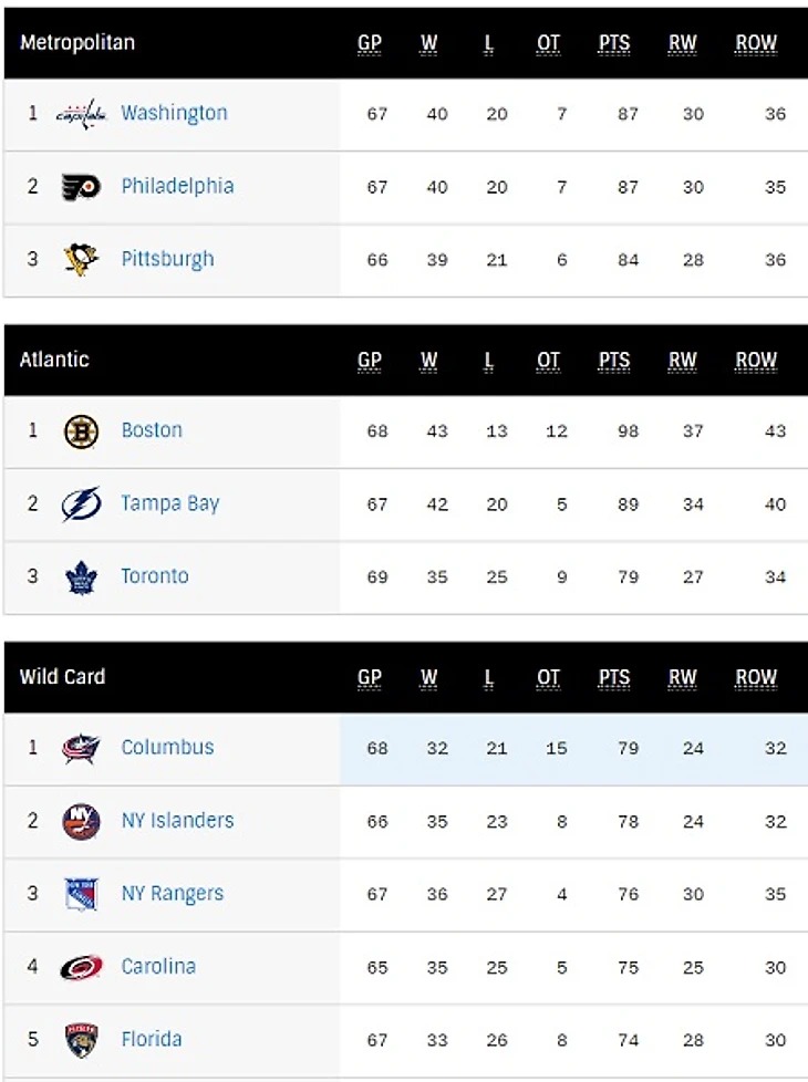 Коламбус опережают Рейнджерс на 3 очка. Но у Рейнджерс есть игра в кармане, при этом график игр Коламбуса наверное самый сложный среди всех команд пытающихся попасть в ПО на востоке через Вайлд Кард. Из 14 оставшихся игр, лишь одна игра с командой, которая не борется за ПО в этом сезоне - что даёт хорошие шансы Рейнджерс их обойти. Последние 10 игр Коламбус провел в режиме 2-4-4.