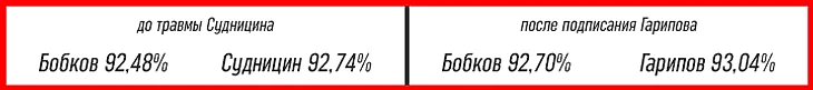 К тому же на статистику можно смотреть по-разному. Сначала сильный вратарь Бобков почему-то отбивал даже чуть меньше, чем второй вратарь Судницин. Аналогично с Гариповым, который не играл целый год. Очень слабо для первого номера, но играть всегда будет Бобков, даже после провалов.