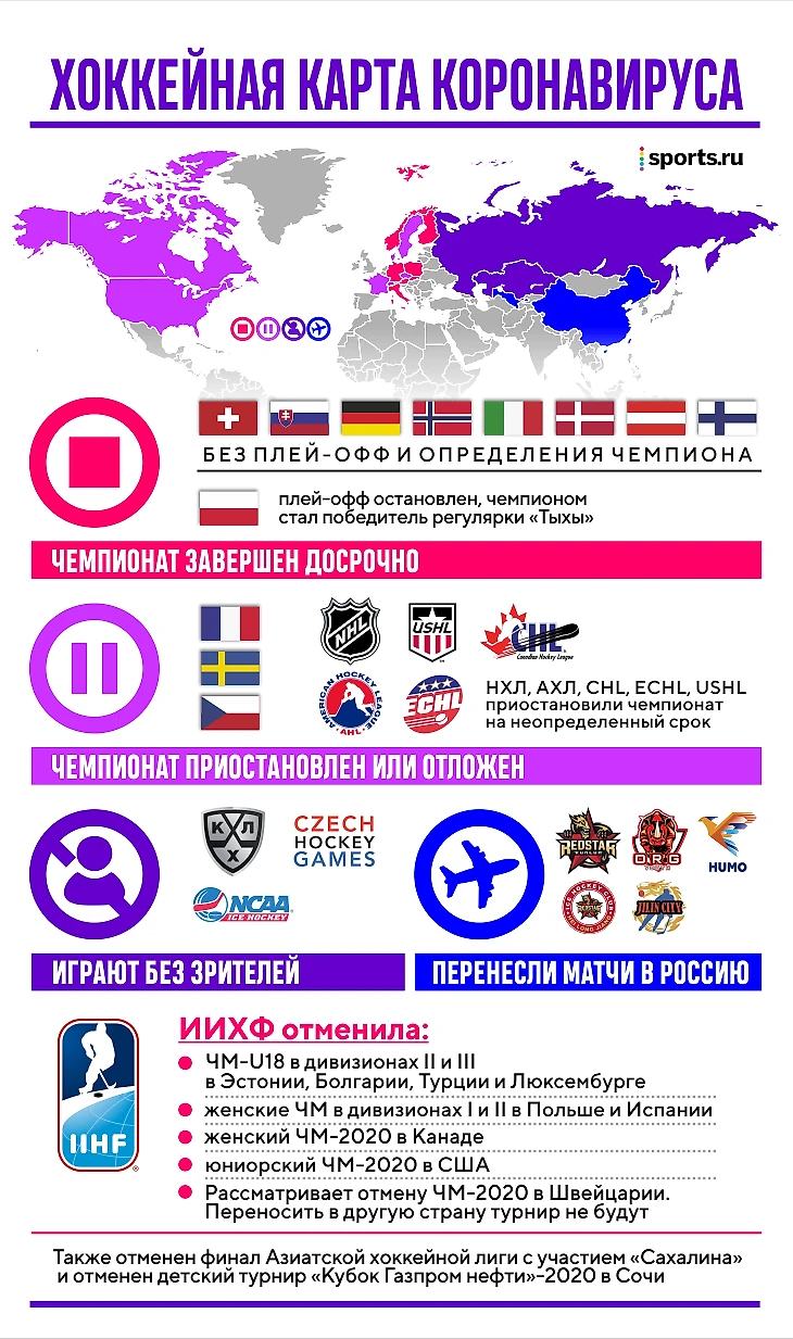 Хоккей долго держался в стороне от коронавируса и всячески старался найти выход из ситуации: например, домашние матчи китайских команд переносили в Россию. Но со временем стало понятно, что проблема вышла за пределы одной страны.