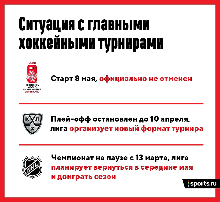 Но по-прежнему не совсем понятно, что будет с хоккеем после паузы. Европейские чемпионаты закрыты, титулы в этом году разыгрываться не будут. ECHL и АХЛ остановили сезон и не собираются его возобновлять по очевидной причине – там не так много денег, как в НХЛ. В итоге, после паузы на карте могут остаться только три точки с большим хоккеем – КХЛ, НХЛ и чемпионат мира, который все еще не отменили. Вот текущая обстановка с турнирами: