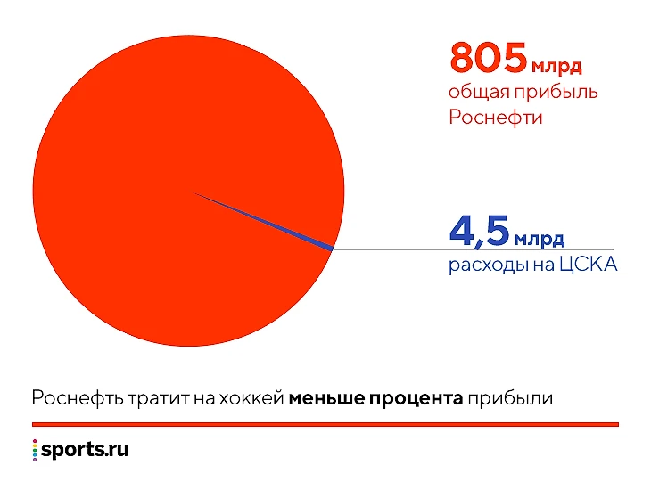 По его данным, «Роснефть» в прошлом году потратила на ЦСКА 4,5 млрд рублей – на 800 млн больше, чем год назад. Цифры вполне логичные – на зарплаты (без учета командных бонусов) клуб тратит 1,75 млрд – традиционно зарплатная часть в КХЛ составляет где-то половину бюджета.
