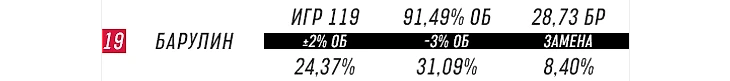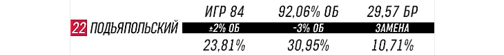 Доля игр, с процентом отражённых бросков заметно ниже (-3% и хуже) своего среднего.