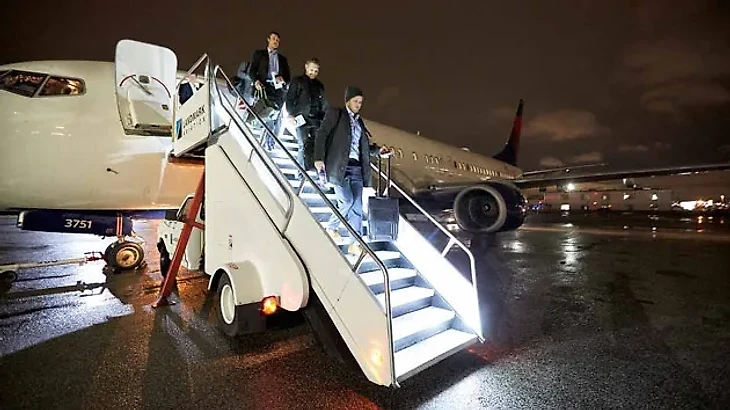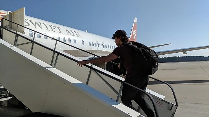 Джастин Фолк садится в самолет.