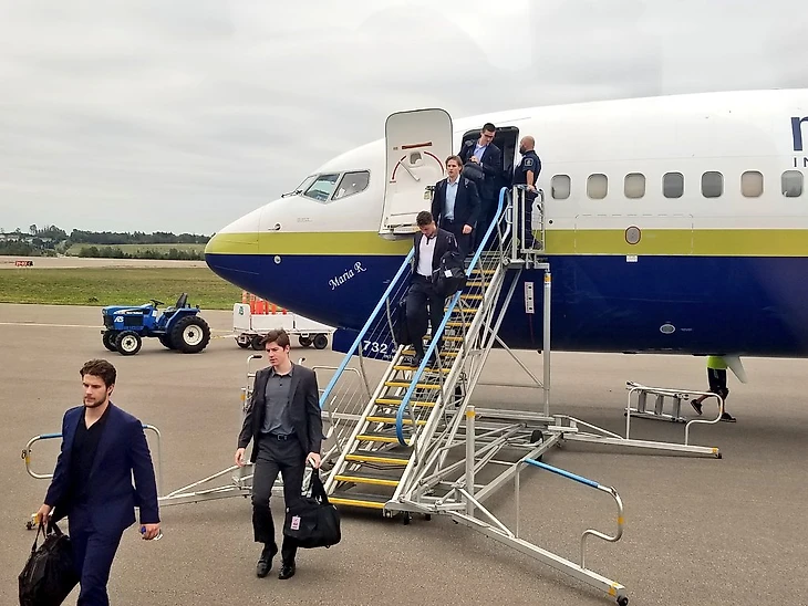 Те же Боинги 737 предоставляет «черным ястребам» авиакомпания Swift Air. На фото хоккеисты «Чикаго» отправляются в очередной выезд по южным штатам.