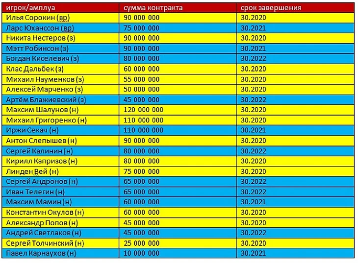 Жёлтым цветом – контракты, завершающиеся в этом сезоне.