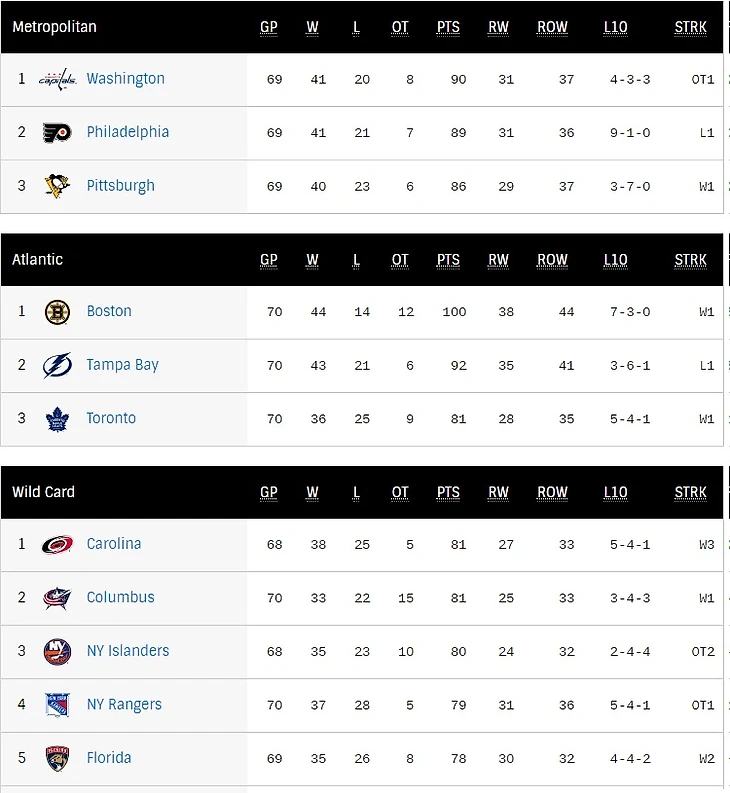 Есть вторая причина, не очень политкорректная и весьма гипотетическая..... у каждой команды свой график, и у одних команд он проще, и у других сложнее, к примеру график Рейнджерс на оставшиеся игры достаточно сложный, у Флориды он гораздо проще, а вот у Коламбуса сложнее, и где спрашивается здесь справедливость?