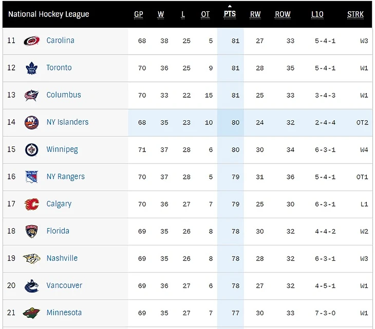 Первая причина заключается в том, что есть команды которые сыграли 71 игру, Например находящиеся поблизости Эдмонтон (83 очка) и Виннипег (80 очков) , а есть комнады у которых 68 игры, например Кейнс (81 очко) и Айлс (80 очков). Рейнджерс между тем заработали 79 очков в 70ти играх.