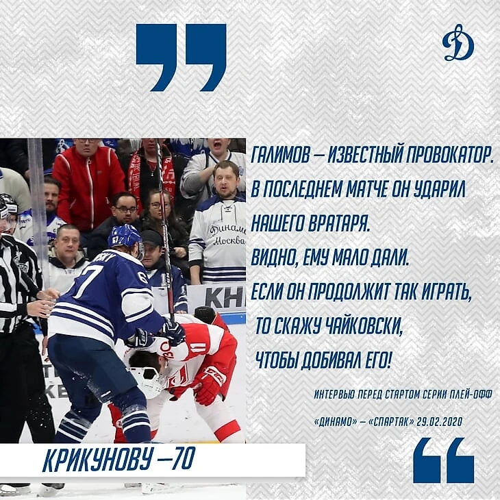 Серия плей-офф «Динамо» – «Спартак» сопровождалась не одной дракой. Шутки в интернете про UFC становились актуальными, но все пропустили, как Крикунов отлично справился с ролью и выдал качественный трешток за два дня до старта противостояния.