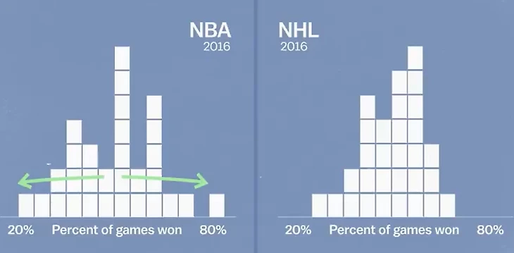 За сезон некоторые команды выигрывают примерно половину своих игр, а некоторые - намного лучше, некоторые намного хуже. Так что, если дисперсия является мерой того, насколько распределены эти победы и поражения для лиги, вы можете видеть, что дисперсия в баскетболе выше, чем в хоккее.