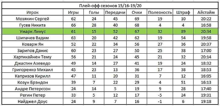 Конечно меня удивил самый худший 87 номер в истории НХЛ на первом месте и это несмотря на то, что у него была командировка в Вегас. Конечно, я ждал, что и Мозякин будет лучшим снайпером, однако Доус обошёл его, во многом благодаря огненной игре в Барысе. Что касается Линуса, то он несмотря на то, что провел больше всех матчей из игроков представленных в таблице и по очкам занимает четвертое место. Умарк стабильно набирал очки и в тройке с Энгквистом и Григоренко, Григоренко и Капризовым, Кемпайненном и Хартикайненом, Маниненом и Хартикайненом, а периодически выдавал удивительные вещи.