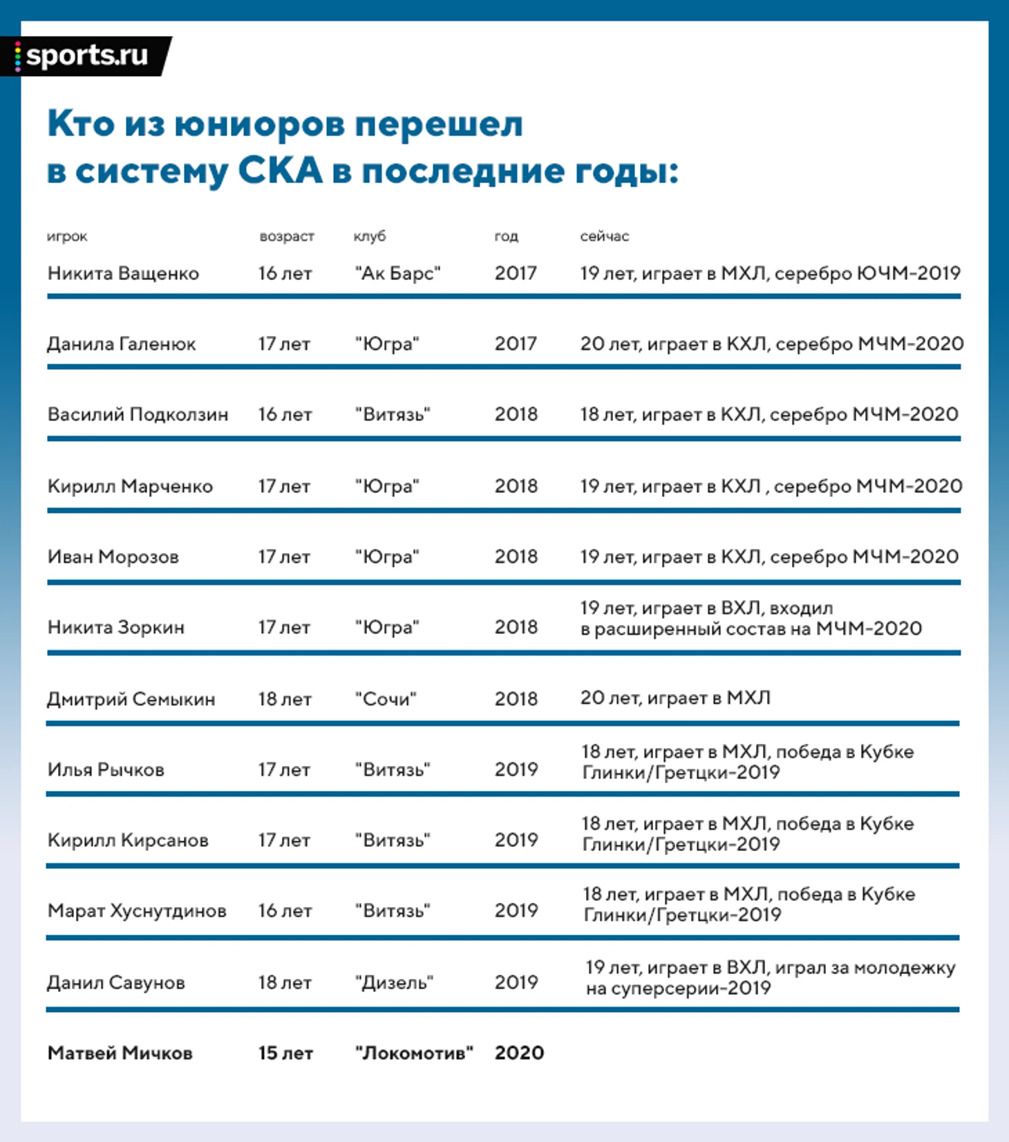 За новостями о главной команде часто можно не заметить трансферы в клубную систему. Обычно им не придают особого значения – как, например, переходам 17-летних Ивана Морозова и Кирилла Марченко из «Югры» в мае 2018-го, или еще 16-летнего Подколзина из «Витязя» за месяц до них. Сегодня СКА подписал нового юниора – 15-летнего нападающего Матвея Мичкова.