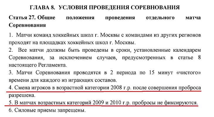 Важность пробросов возрастает с возрастом, да и юных хоккеистов стараются подводить к этому правилу постепенно. Например, по регламенту турниров Федерации Хоккея Москвы, пробросы не фиксируются у двух младших возрастов (в этом сезоне это был 2010 и 2009 года рождения), а у 2008 года разрешена смена состава после проброса. По "взрослым" правилам в этом сезоне играли команды 2007 года рождения и старше, когда формат Кубка переходит на формат Открытого первенства. С этого же возраста, кстати, разрешены и силовые приемы.