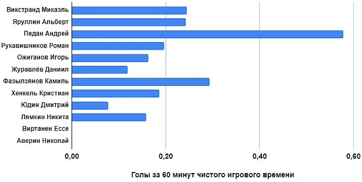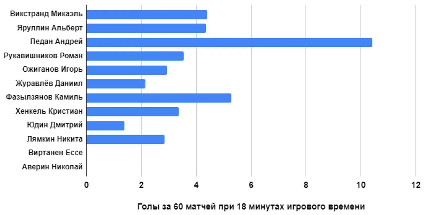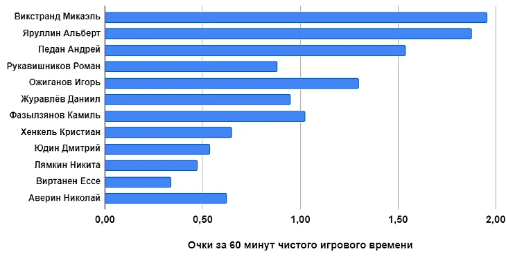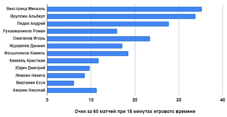 С таким игровым временем Педан будет способен набрать чуть меньше 30 очков за 60 матчей. Также у нас обнаруживается группа игроков с потенциальной результативностью от 15 до 20 очков за сезон: Рукавишников, Журавлёв и Фазылзянов: