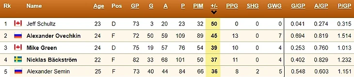 Ещё занимательный факт: с тех пор, как в сезоне 2002-03 Форсберг и Хейдук набрали полезность +52, только защитник Вашингтона Джефф Шульц 10 лет назад смог добрался до отметки +50 за сезон. В том году ударная пятёрка Кэпс Грин-Шульц, Овечкин-Бекстрем-Сёмин в полном составе заняли 5 первых мест в лиге по полезности. Причём единоличным лидером оказался самый неприметный Шульц.