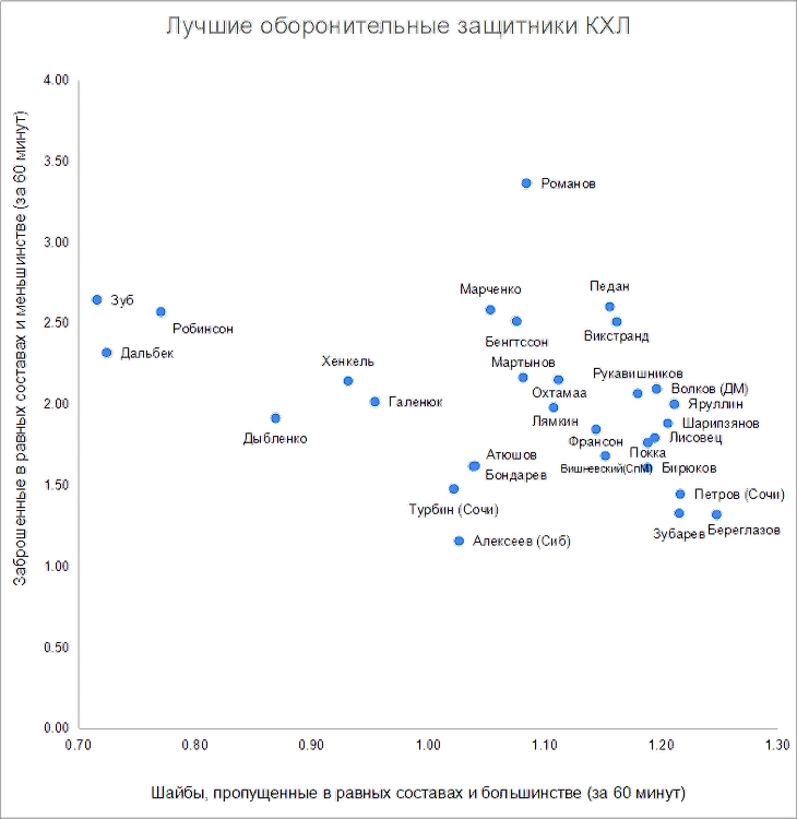 По оси X на этом графике отображаются шайбы, пропущенные в равных составах и большинстве, в пересчёте на 60 минут чистого игрового времени. То есть если человек провёл 4 матча со средним игровым временем 15 минут и команда пропустила 1 шайбу когда он находился на льду (меньшинство не считаем), то его коэффициент надёжности составляет 1.0. Если у всех защитников команды коэффициент надёжности будет равен 1.0, то за сезон команда пропустит 62 шайбы в равных составах и большинстве (не считая овертаймов). Для сравнения, в прошедшем сезоне ЦСКА пропустил 73 шайбы в таких условиях, это лучший показатель в лиге. Спасибо Дальбеку, Марченко, Робинсону и Романову. По оси Y - шайбы, заброшенные в равных составах и меньшинстве (также в пересчёте на 60 минут). К большинству участников рейтинга нет вопросов, удивительны высокие места Дыбленко, защитников-белорусов, Алексеева, защитников-ветеранов и пары защитников ХК Сочи.