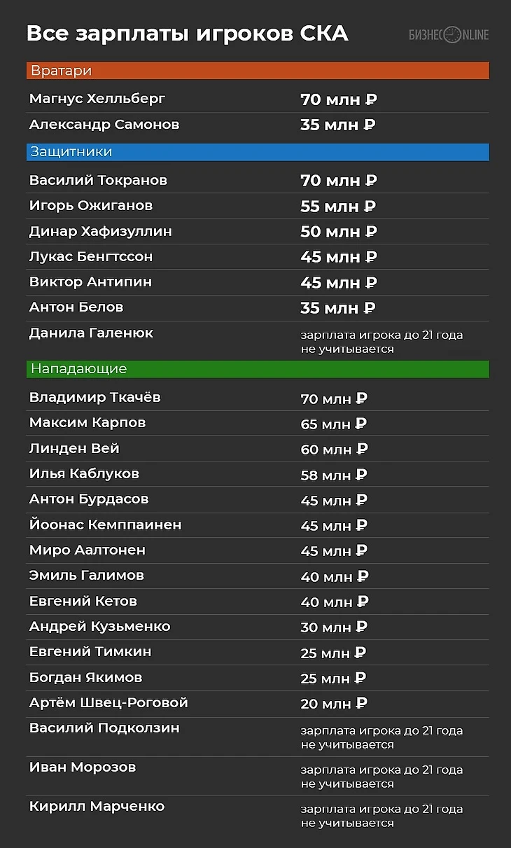 Самым высокооплачиваемым игроком СКА до вчерашнего дня был защитник Игорь Ожиганов с контрактом 75 млн рублей в год. Такую зарплату ему дали в «Ак Барсе», откуда игрока обменяли в СКА в ноябре 2019 года. Вчера игрок подписал новый контракт на два года (хотя старый заканчивался по окончании следующего сезона) с понижением зарплаты на 20 миллионов.