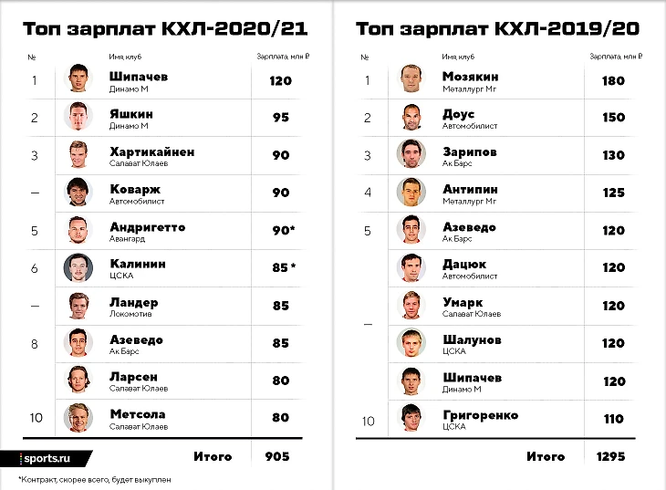 Самые большие зарплаты КХЛ с появлением потолка: топ-10 стала на 30% дешевле, особенно пострадали ветераны