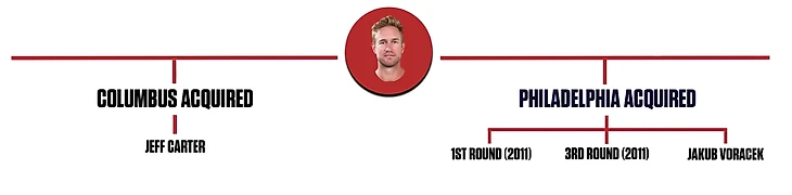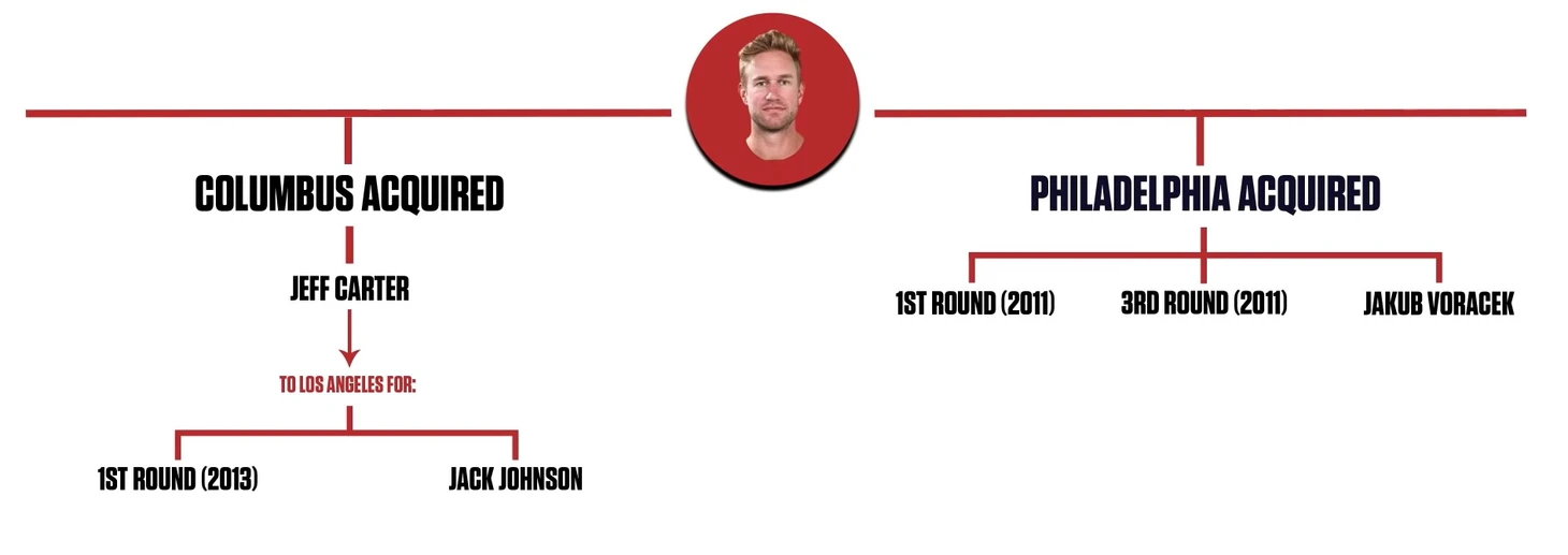 Летом 2011 "Филадельфия" обменяла Джеффа Картера в "Коламбус" в обмен на пик в первом раунде на драфте 2011 года, пик в третьем раунде того же драфта и молодого и перспективного Якуба Ворачека. Здесь давайте немного о "Коламбусе". Клуб впервые в своей истории попал в плей-офф в 2009! Всё было круто, пока их оттуда не вымели, а вот уже в 2010 и 2011 "мундиры" оставались без розыгрыша Кубка. Но у "Коламбуса" была звезда! Звезда по имени Рик Нэш, которого они ни при каких обстоятельствах не хотели терять. Поэтому решили подумать на перспективу и сказали: "Хмм, Рик, а почему нам не взять тебе навсегда в звено центром этого яркого Джеффа Картера?". "Коламбус" мог и правда собрать очень грозный дуэт в атаке, и на бумаге все выглядело просто супер. Да, они отдают Ворачека, который в принципе неплохой игрок, ну а пики в 1 и 3 раунде - по барабану, это же не какие-то волшебные семена, верно? Путь к безумию...