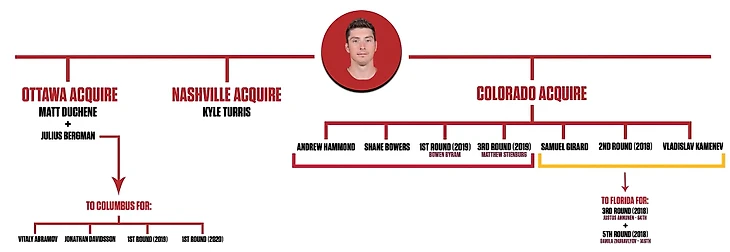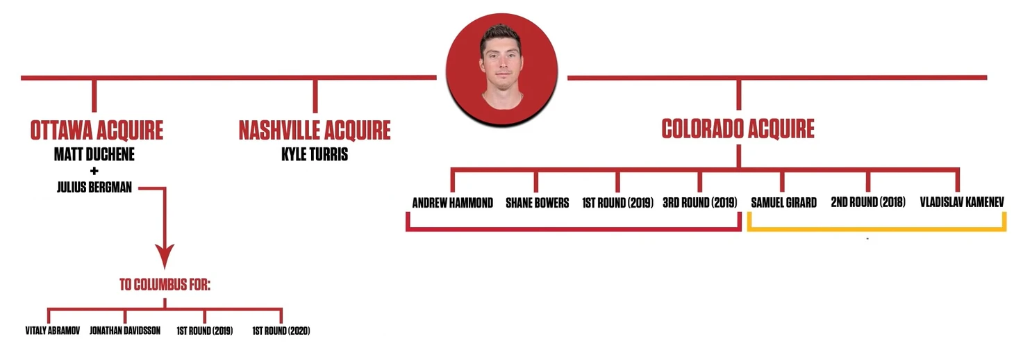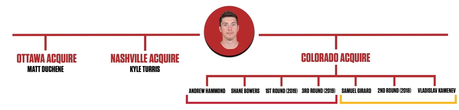 Может показаться, что здесь есть плюс - высокий выбор на драфте 2017. Ничего подобного. "Колорадо" потеряли первые три пика на лотерее и выбирали только четвёртыми. Ну да ладно, они взяли Кейла Макара, так что повезло. После того сезона Мэтт Дюшейн откровенно сказал, как Ельцин в 1999-ом: "Я устал, я ухожу". Пришёл, естественно, к Сакику - кумиру своего детства. Но каким бы храбрым не делал своё лицо Мэтт, Сакик сказал твердое "нет" и начать следующий сезон Дюшейну пришлось в джерси "лавин". 14 игр, 10 очков - вот Мэтт Дюшейн образца сезона 2017-18 в "Колорадо". Джо Сакик уже на телефонах, и ему приходит гениальная идея: "Эй, я хочу обменять одного паренька, который больше не хочет играть здесь и вы оба отдаете мне взамен 7 вещей". "Нэшвилл" и "Оттава" в один голос кричат громогласное "ДА"! Так и случился этот трёхсторонний обмен.