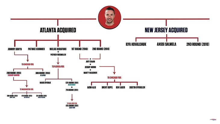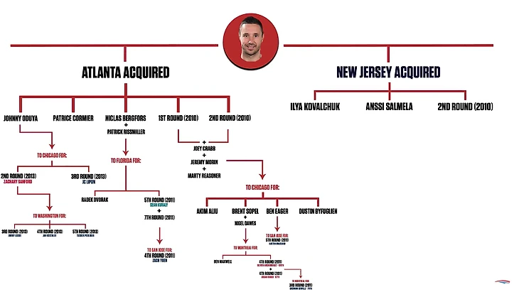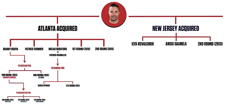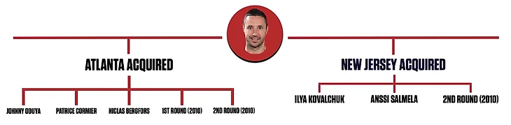 4 февраля 2010 года "Трэшерс" всё же пошли на изменения и заключили ту самую знаменитую сделку с "Нью-Джерси". Опций в этом обмене было выше крыши, но давайте разбираться с каждой по порядку. "Нью-Джерси Девилс" помимо Ильи Ковальчука получил также защитника Ансси Салмелу и пик во втором раунде драфта 2010 года. В свою очередь в "Атланту" отправились защитник Джонни Одуя, молодой проспект Патрис Кормье, молодой проспект Никлас Бергфорс, а также пики в 1 и 2 раундах драфта 2010 года.