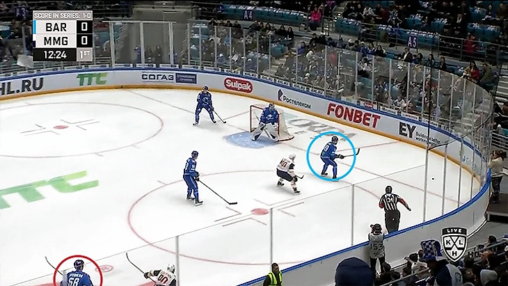 Тот же эпизод, но десятью секундами позже. Ответная атака и Найт уже слева в защите догоняет вброшенную шайбу.