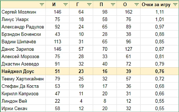 "Барыс" и "Автомобилист" с Доусом так и не добились кубковых успехов ("а должны были добиться?" ехидно спросит кто-то). С другой стороны, в сравнении с топ-игроками по количеству набранных очков в плей-офф КХЛ Доус выглядит неплохо: