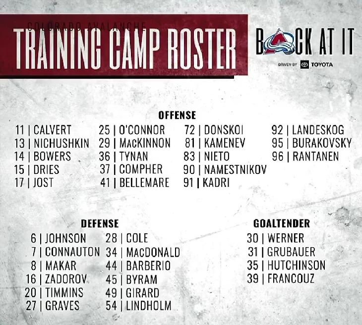В ростере отсутствует Эй Джей Грир, которого "Колорадо" выбирал во втором раунде драфта 2015 года под 39-м номером. Форвард один из лидеров фарма уже 4-ый сезон, но в НХЛ все никак не мог закрепиться. А шансов ему давали не мало. Отсутствие в расширенном списке - приговор перспективам Грира в составе "Колорадо".