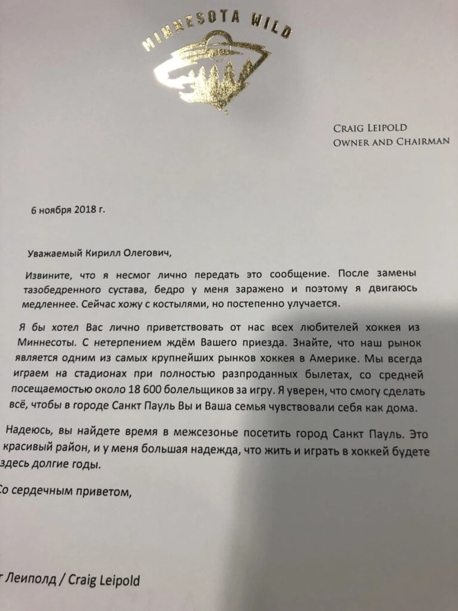 Кирилл и его агент Пол Теофанос все еще занимаются оформлением визы и хотят успеть до 26 июля – после этой даты команда уедет в Эдмонтон готовиться к плей-офф, а руководство клуба хочет, чтобы Капризов успел познакомиться с новыми партнерами по команде. Впереди у него необычно долгий перерыв между сезонами и увлекательный первый сезон в НХЛ, а пока владелец «Миннесоты» может быть доволен – два года назад он не зря отправлял милое письмо, переведенное через гугл-переводчик.