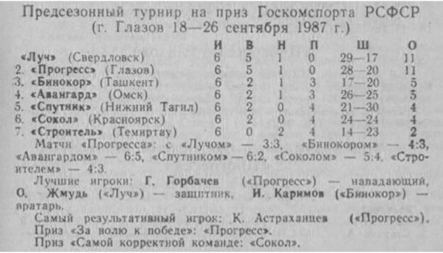 Таблица предсезонного турнира на приз Госкомспорта РСФСР в Глазове (18-26 сентября 1987 года)