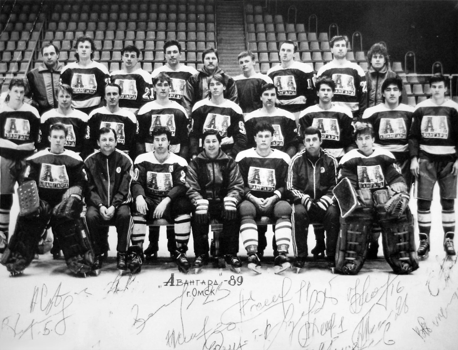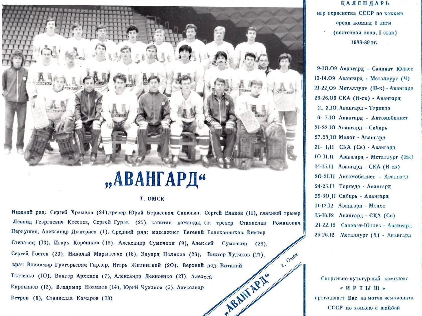 1988/89. «Авангард» (Омск). Экс-бинокоровцы: Юрий Чуканов - четвертый слева в верхнем ряду, Владимир Капуловский - второй справа в верхнем ряду, Алексей Сумочкин - четвертый слева в среднем ряду, Александр Сумочкин (№ 9) - пятый слева в среднем ряду