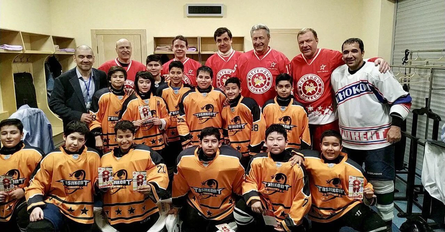 15 марта 2019 года. Ташкент. «Хумо Арена». Алишер Азимов (в ретро-форме «Бинокора» восьмидесятых) и Абдумаджид Насыров (крайний слева в верхнем ряду) с юными ташкентскими спортсменами и ветеранами советского и российского хоккея (слева направо): Виталием Прохоровым, Павлом Буре, Валерием Каменским, Александром Якушевым и Алексеем Жамновым