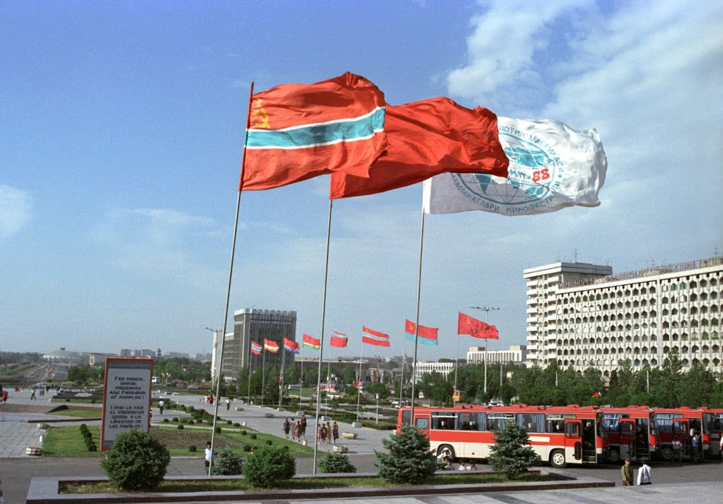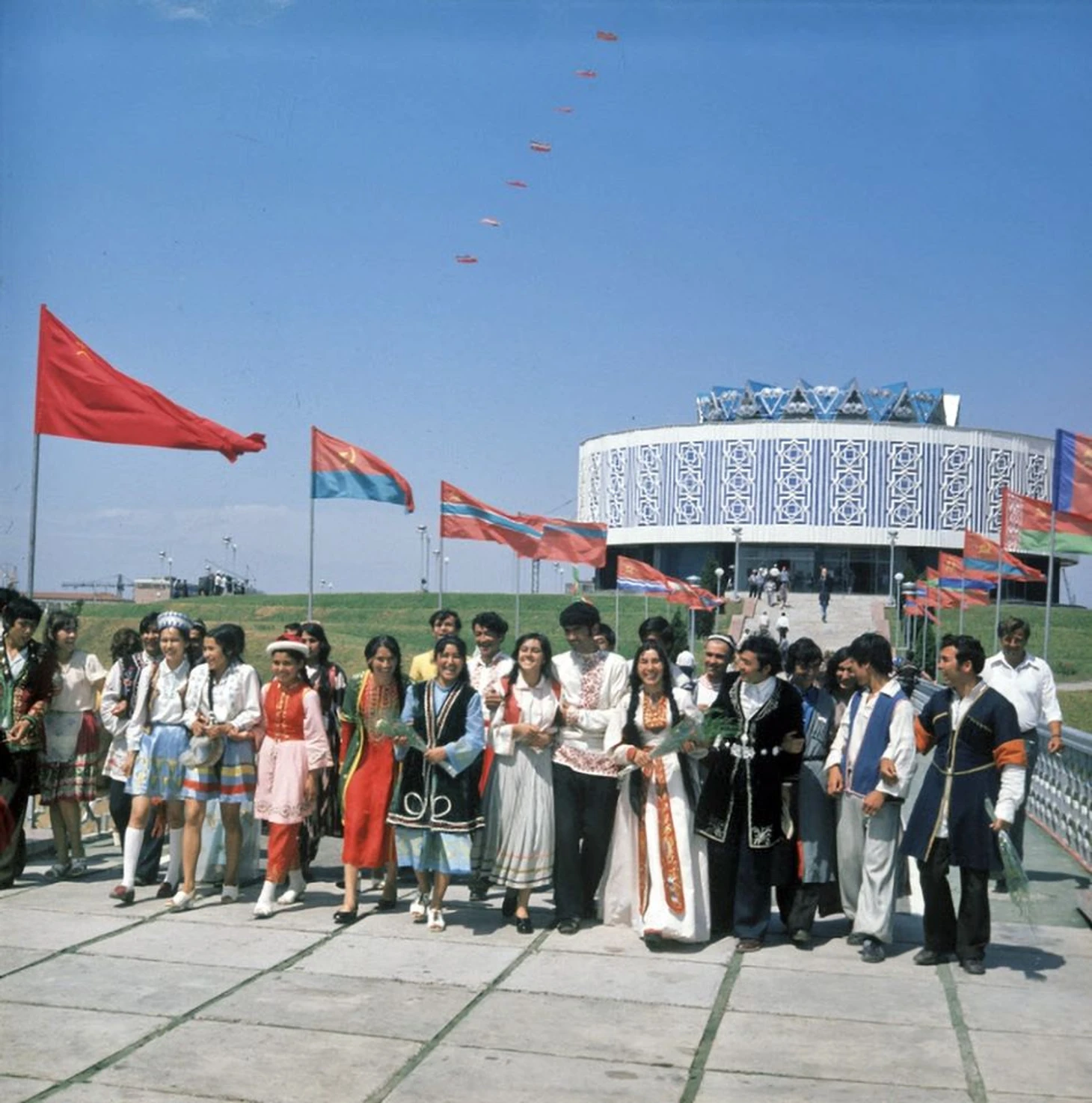 1988. Ташкент Площадь Дружбы народов в дни проведения десятого Международного кинофестиваля стран Азии, Африки и Латинской Америки. В здании на дальнем плане в середине снимка размещался трест «Главташкентстрой», честь которого «Бинокор» отстаивал в чемпионатах страны (Галина Кмит / Библиотека изображений «РИА Новости»)
