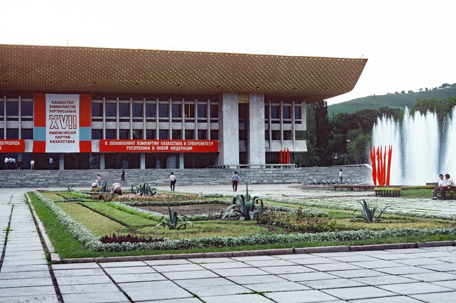 Июнь 1990 год. Алма-Ата. Дворец имени В.И.Ленина. Лозунг на фасаде «К обновлению компартии Казахстана и суверенитету республики в новой федерации», приуроченный к XVII съезду компартии Казахстана (фотограф Эрнст Клюге / Ernst Kluge)